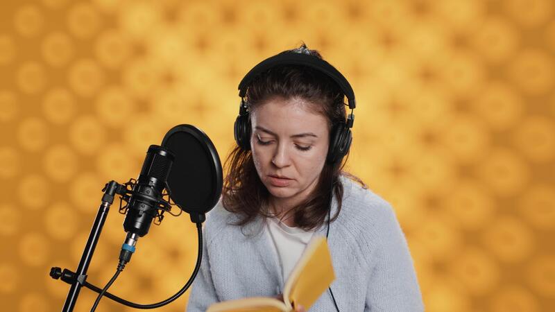 Lady browsing pages, doing voiceover reading of book to produce audiobook. Voice actor preparing to use storytelling skills to entertain audience while recording novel, studio background, camera A Pro Video