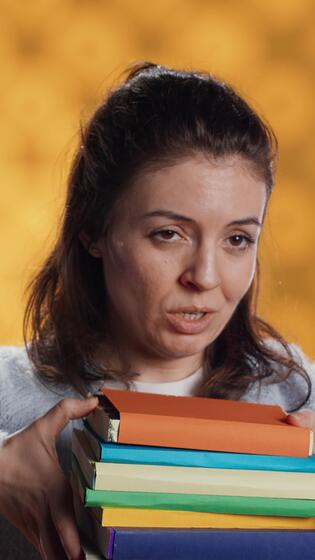 Vertical Woman choosing between physical books and ebooks, favoring ereader for lightness, studio background. Bookworm picking digital literature on tablet in front of heavy stack of novels, camera A Pro Video