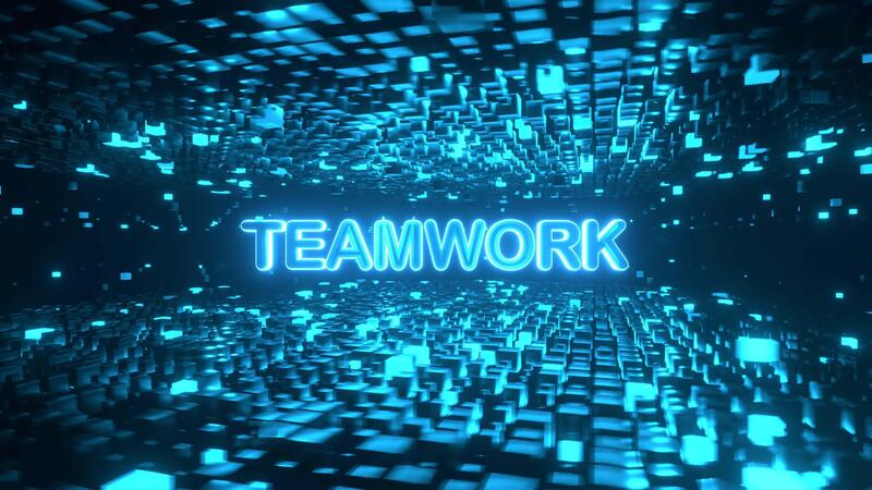 TEAMWORK text inside rotating cube platforms in cyberspace. High-tech neon 3D animation. Free Video