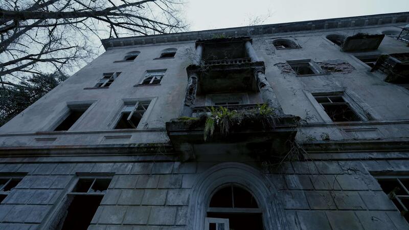 An old abandoned building. Action. A dark building with broken and empty windows inside which there is nothing against the white background of the sky. Pro Video