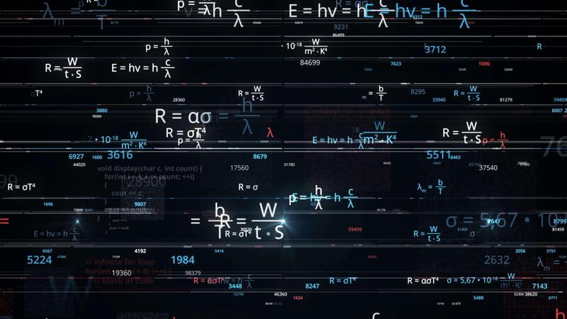 Blocks of abstract mathematical formulas are written and moved in the virtual space. Animation. The camera flies through the mathematical formulas on black background, seamless loop. Pro Video