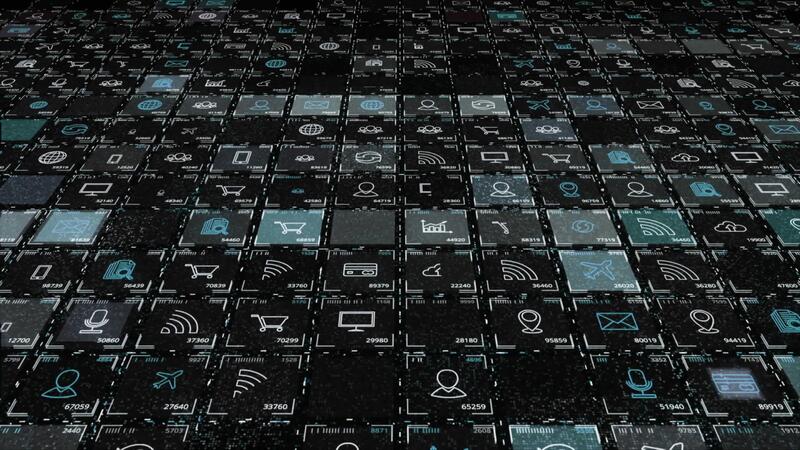 Pattern made of colorful display with blinking and changing media icons, seamless Loop. Animation. Concept of addiction to internet and social media. Pro Video