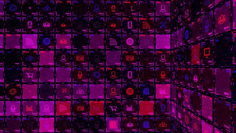 Abstract technological icons in a dark pink and red grid interface. Animation. Digital screen with blinking symbols of internet connection, devices, downloads, and communication. Pro Video