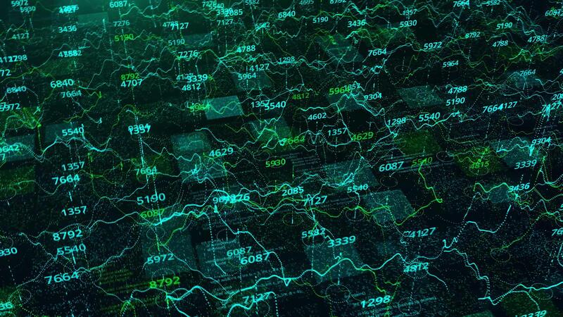 Technological background with the analytics and statistics data with graphs on black background. Animation. Green and blue changing graphics and numbers. Pro Video