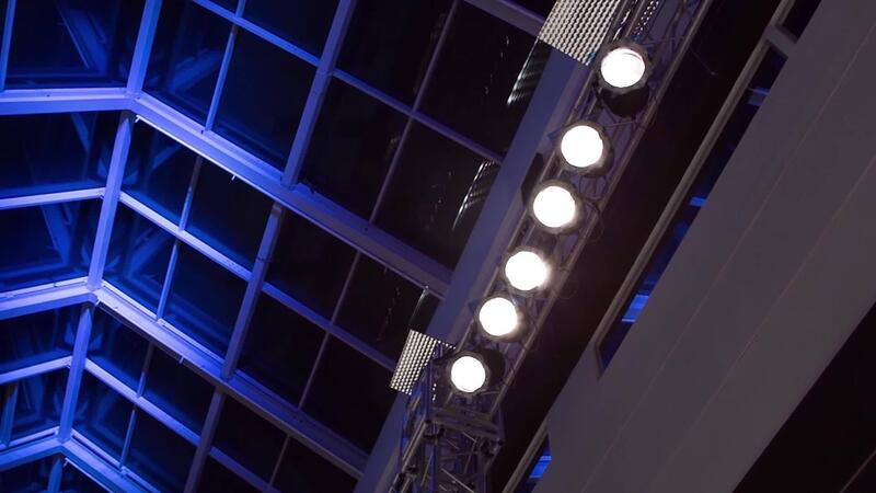 Bottom view of a glass ceiling with blue illumination and a row of shining spotlights. . Details of a hall architecture. Pro Video
