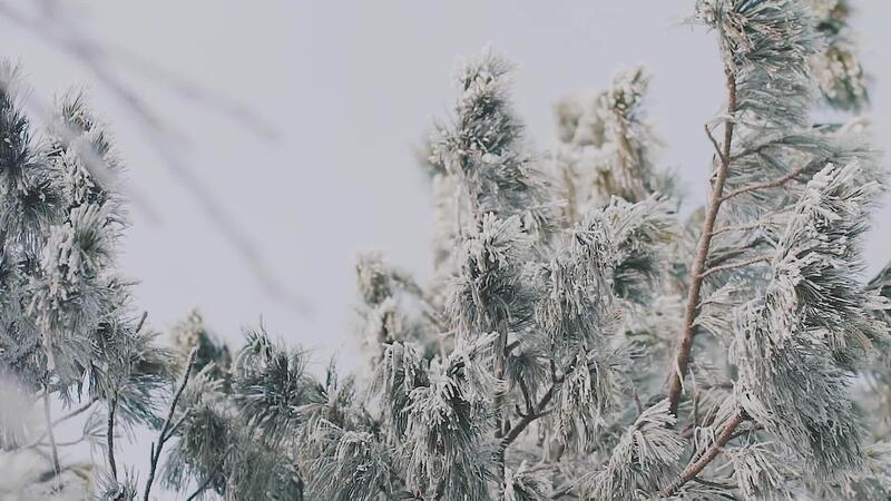 Snow covered branch of fir tree in winter forest. Scene. Pine tree after heavy snowfall, nature in winter cold season. Pro Video