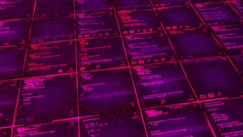 Abstract background with digital squares of data. Animation. Seamless loop motion of pink 3D rows of self written lines of changing code. Pro Video