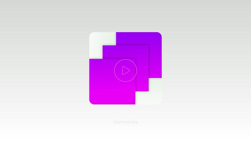 Purple squares on light background, concept of smartphone technologies. Motion. Round shaped silhouette with a triangle inside appearing on each square, play icon and the memories inscription. Pro Video