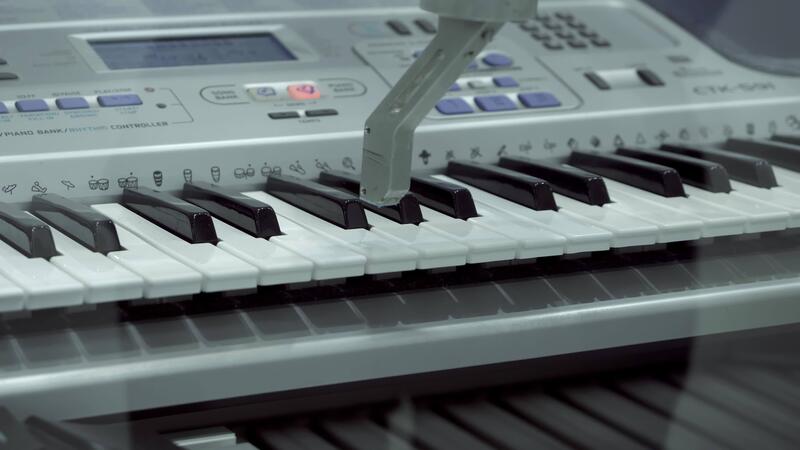 Robotic mechanism plays piano. HDR. Exhibition of robotics with practical performances for demonstration. Primitive robotic hand plays synthesizer. Exhibition of Robotic Equipment Pro Video