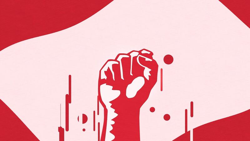 Fist raised up on background of flag. Animation. Motivating slogan in form of fist rising up on background of waving flag. Slogan with call to revolt or uplift spirit Pro Video