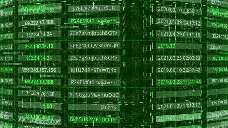 Hacking passwords and addresses. Animation. Passwords and addresses are publicly available after being hacked by hackers. Password configurations in tabular form with personal address data Pro Video