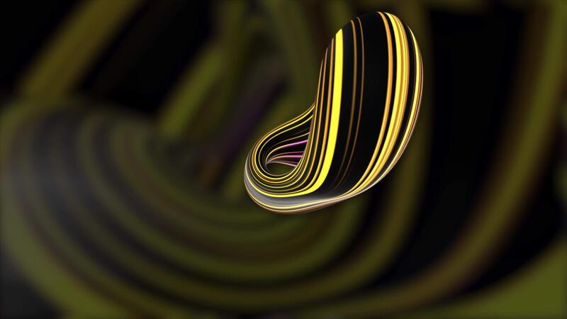 Rotating 3D circle on the background of a striped yellow and black corridor. Motion. Moving curvy dynamic irregular shape resembling an o letter, seamless loop. Pro Video