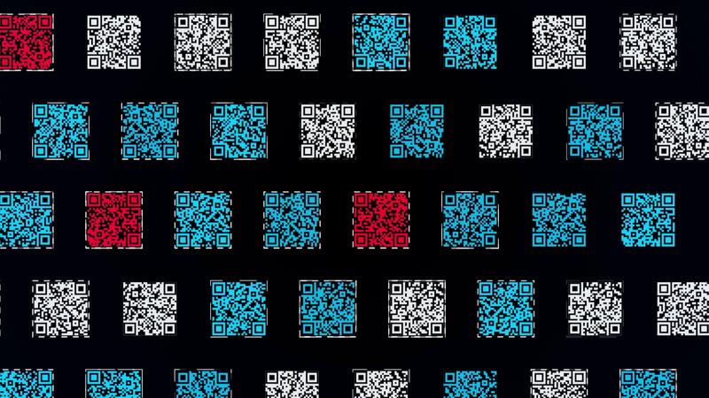 Colorful QR codes on black background. Animation. rows of codes move like a snake. Lot of QR codes move through rows. Matrix barcodes with information about various objects Pro Video