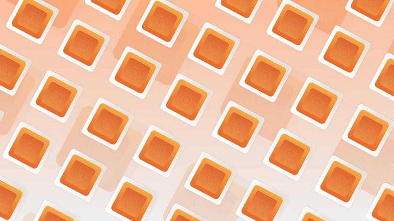 Rows of orange squares on gradient light background, seamless loop. Motion. Round shaped silhouette with a triangle inside appearing on each square, play icon. Pro Video
