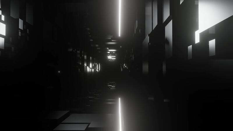 Flying through futuristic shadowy alien cube tunnel, seamless loop. Design. Endless corridor of different cubes and light stripes. Pro Video