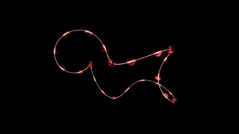 Abstract looped line with colorful neon illuminated spheres moving one by one very fast. Design. Curving narrow stripe and running signals isolated on a black background. Pro Video