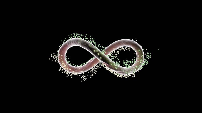 Infinity sign with the endless flowing energy isolated on a black background, seamless loop. Design. Abstract glowing infinity symbol with a cloud of particles, concept of fate. Pro Video