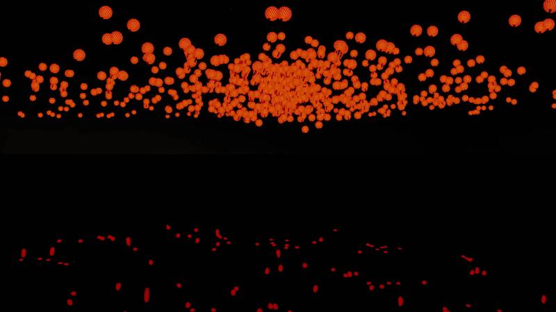 Abstract swarm of red particles gathering and disappearing with the reflection on the opposite side of a screen. Design. Many colorful spots forming a cloud and rotating on a dark background. Pro Video