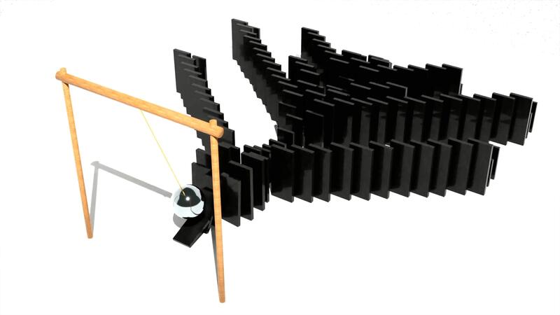 3D pattern of falling dominoes. Design. Newtonian ball hits and knocks down dominoes. Lot of dominoes fall in pattern from impact of ball on white background Pro Video