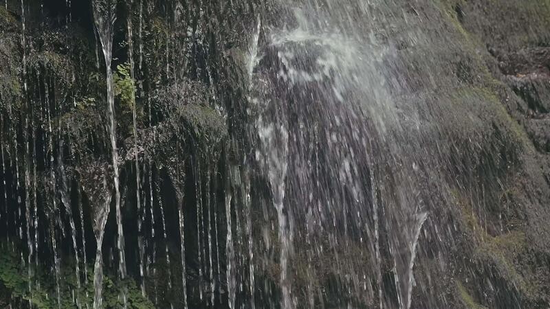 View of a small waterfall from the mountain. Creativity. Small drops of water dripping down against the background of a little visible large trees and skylights from the sun Pro Video