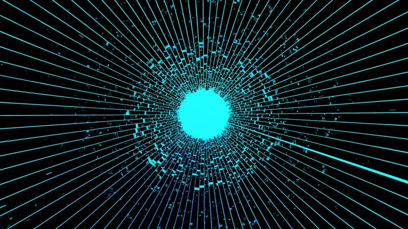 Moving inside an abstract digital corridor towards blue glowing core. Design. Spinning tunnel with rays and small particles around a bright circle in the middle. Pro Video