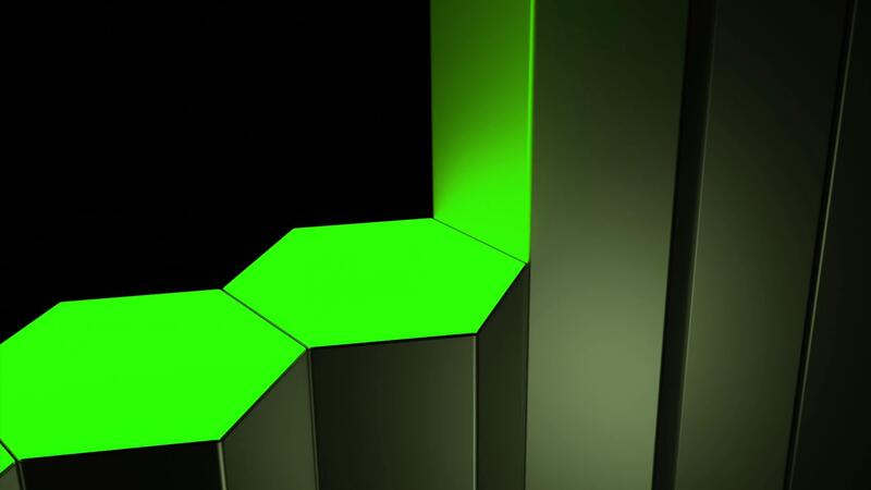 3D vertical green bars of hexagonal shape rising up one by one on a black background, seamless loop. Design. Visualization of 3D chart. Pro Video