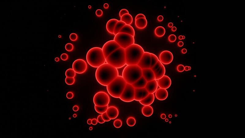 Animation of bacteria under microscope. Design. Microbes or infected cells under microscope. Round image of red infected dots on black background Pro Video