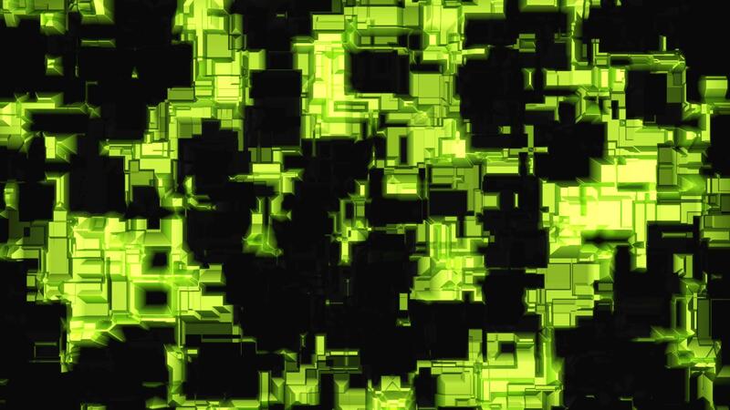 Black background. Design. A bright background with green and orange illuminated particles that flash like puzzles in turn in abstraction. Pro Video