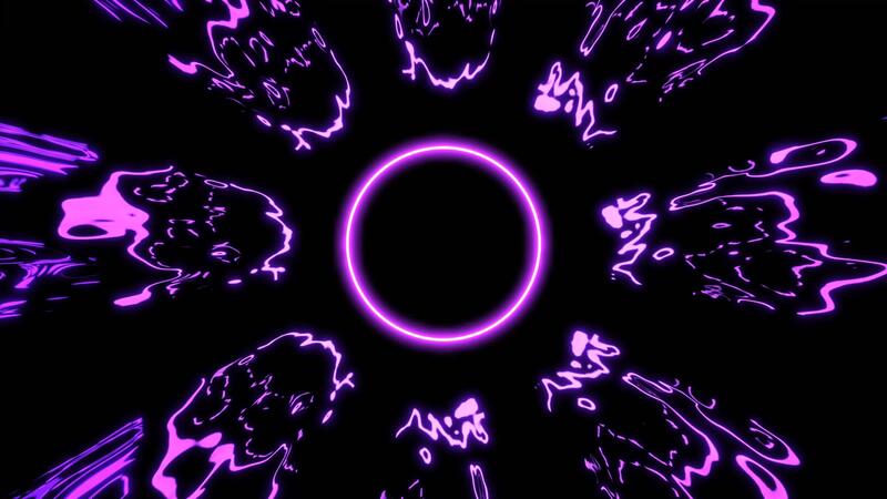 Black background. Design. Bright blots of purple and orange in abstraction that create a pattern with a circle in the center, next to which are iridescent rays of light. Pro Video