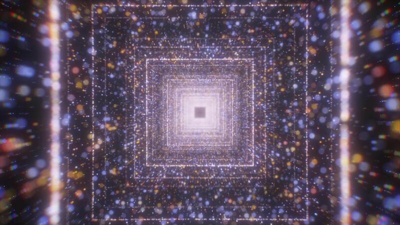 Moving in square cyber tunnel with particles. Motion. Glowing particles in tunnel with neon squares. Square spatial tunnel with flow of colorful particles Pro Video
