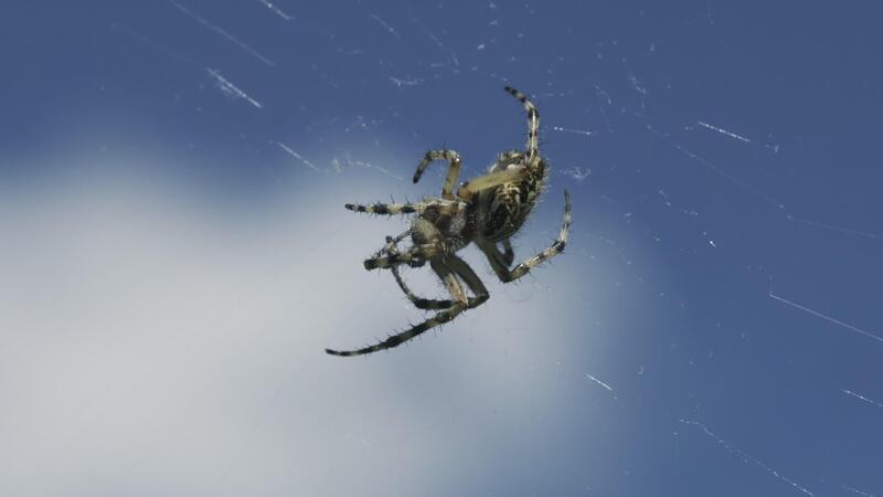 Close-up of large spider on web on background of sky. Creative. Wild meadow spider with web on blue sky background. Beautiful meadow spider on web in sunny day. Macrocosm in summer meadow Pro Video