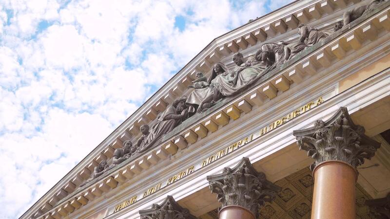 Bottom view of columns of cathedral in St. Petersburg. Action. Beautiful sculptures on pediment and columns of old cathedral. Majestic cathedral with columns on background of sky Pro Video
