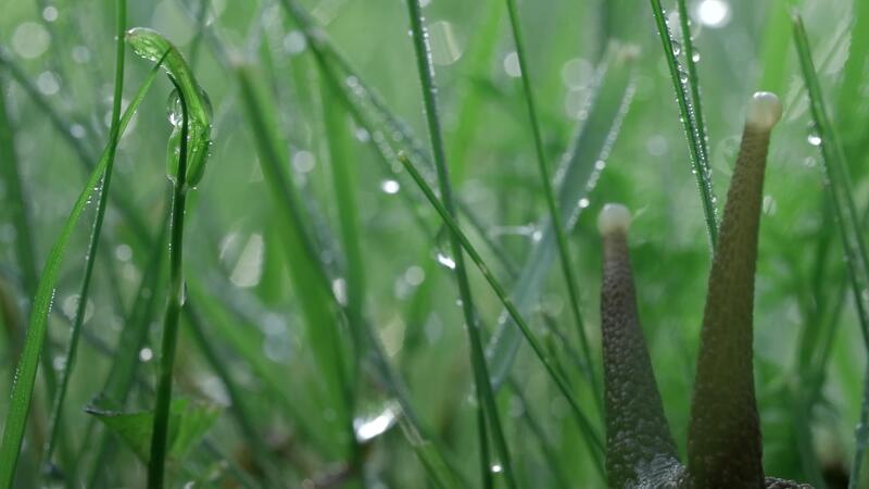 Close-up of grape snail in grass. Creative. Whiskers of large snail in green grass. Grape snail came out into grass after summer rain. Macrocosm of summer meadow Pro Video