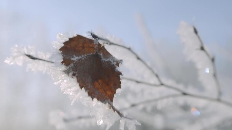 Close-up of beautiful tree branch in frost. Creative. Tree branch covered with frost. Winter frost on branches of tree on sunny day Pro Video