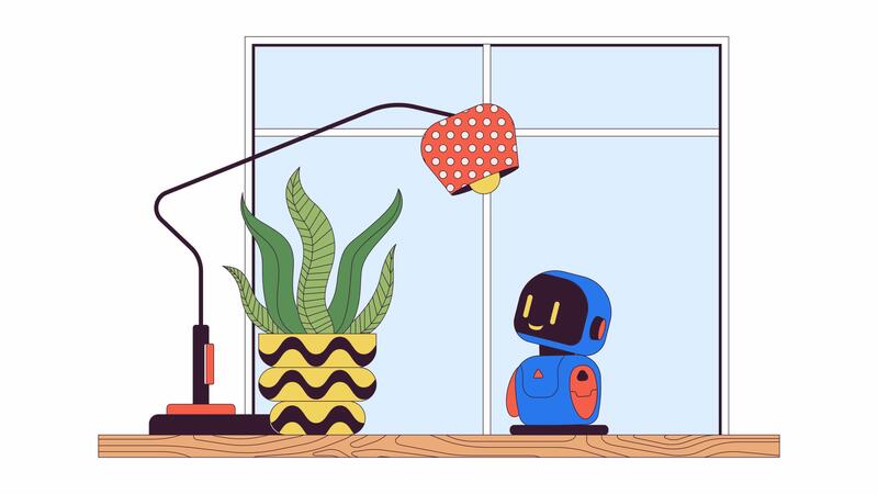 Small companion robot on desk office line cartoon animation. Wow amazed tech 4K motion graphic. Study buddy bot tabletop lamp houseplant 2D linear animated character isolated on white background Pro Video