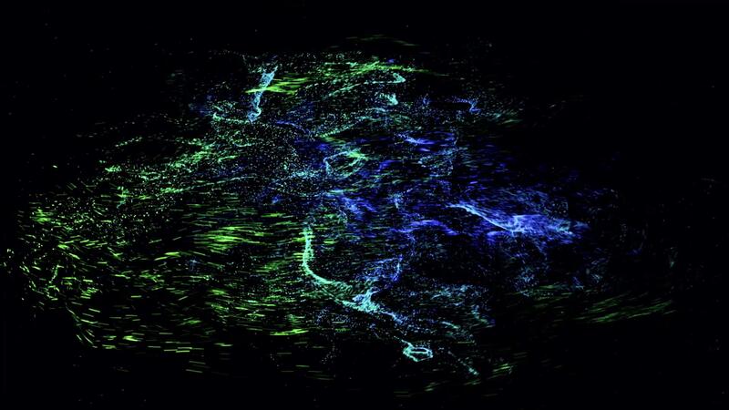 Abstract rotation of symbol of Android, logo made from small green flying particles on black background. Animation. Green android robot becoming a rotating cloud of colorful dots. Free Video