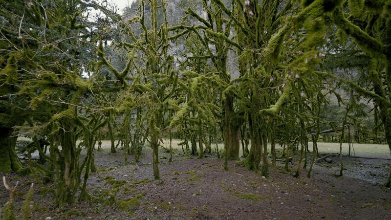 Close up of branches of thuja trees with a wide path. Action. Green grove and the grass field behind it. Free Video