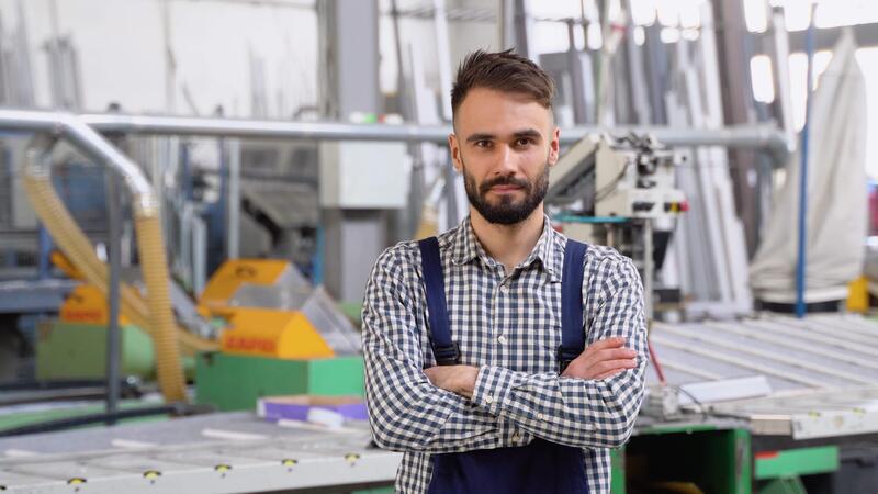 Waist up portrait of bearded factory worker looking at camera while standing in workshop Pro Video