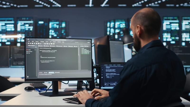 Developer typing code, working in network security data center facility, ensuring optimal performance. IT professional using desktop PC to monitor energy consumption across blade server clusters Pro Video