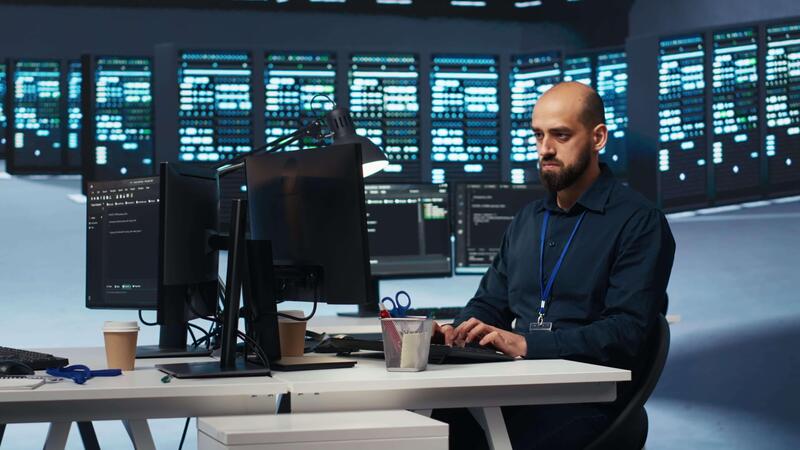 Computer scientist in server farm coding, ensuring data remains shielded from threats. IT programmer safeguarding supercomputers against unauthorized access, securing system from virus attacks Pro Video