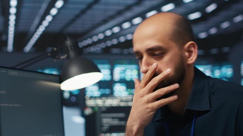Overworked engineer feeling stressed while coding in data center facility, trying to ensure optimal performance of supercomputers. Tired man feeling fatigued while using PC to monitor server cabinets Pro Video