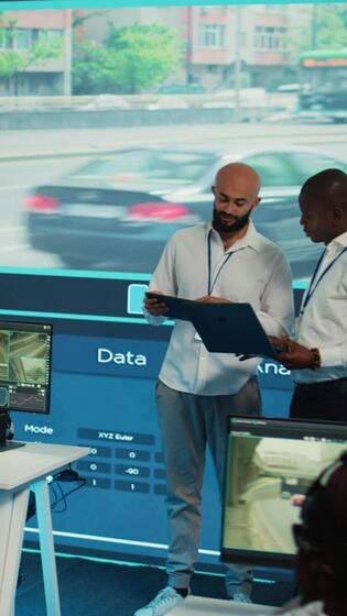 Vertical Diverse employees using CCTV surveillance system in monitoring traffic, tracking speed limits for public safety via satellite radar system. People operating on a big screen in control center. Camera B. Pro Video