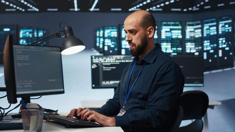 Engineer coding, working in network security data center facility hosting supercomputers, ensuring optimal performance. IT expert using desktop PC to monitor energy consumption across server cabinets Pro Video