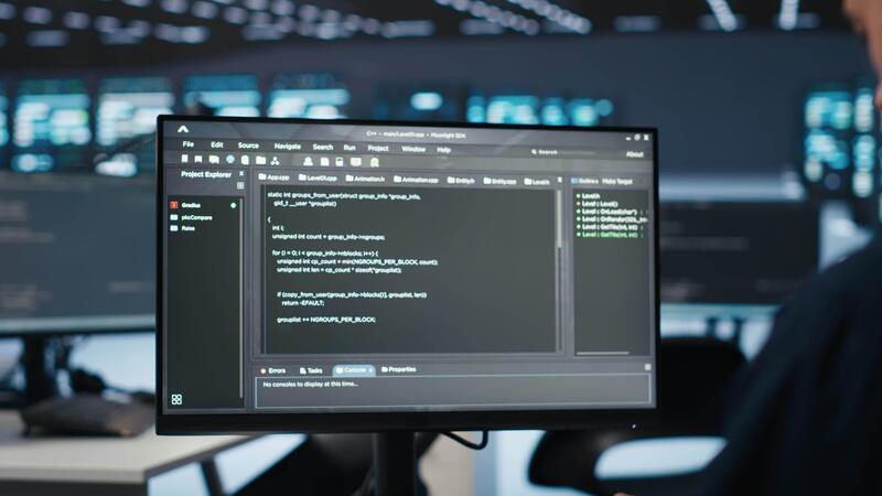 System administrator running script on computer screen in high tech data center, ensuring optimal performance. Worker monitoring energy consumption, doing checkup on server rackmounts clusters Pro Video