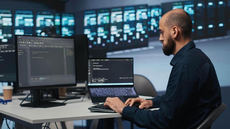 Man in server room typing code on laptop and PC, ensuring data remains shielded from threats. IT expert using notebook and computer to protect supercomputers against unauthorized access Pro Video
