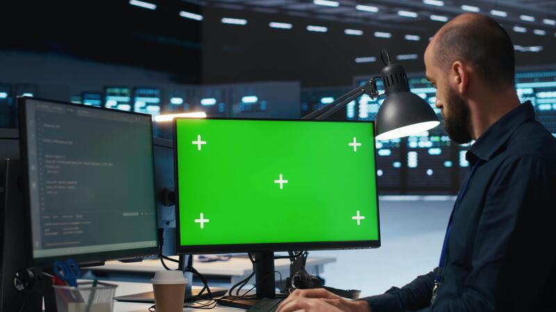 System administrator working on green screen computers in data center, ensuring optimal performance. Worker monitoring energy consumption across servers with mockup PC displays Pro Video