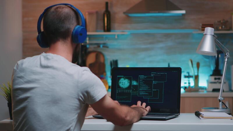 Unsuccessful trying of hacker to steal from company server annoying the man while working from home. Programmer writing a dangerous malware for cyber attacks using performance device during midnight. Pro Video