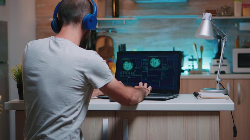 Male hacker failing in coding a dangerous virus to attack company database, angrily shutting down the laptop. Programmer writing a malware for cyber attacks using performance device during midnight. Pro Video