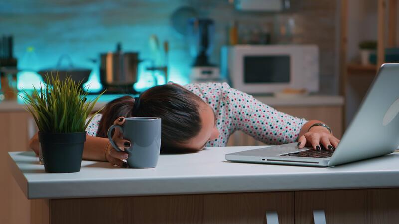 Businesswoman who worked until midnight on project felling asleep on desk working from home with hand on keyboard. Employee using modern technology network wireless doing overtime sleeping on table. Pro Video