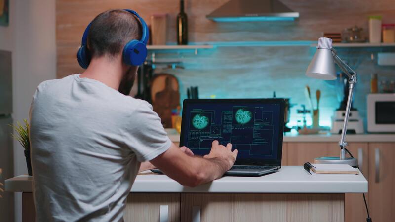 Back view of hacker with headset attacking succesfully the government using finetech, working from home in midnight. Programmer writing a dangerous malware for cyber attacks using performance device Pro Video